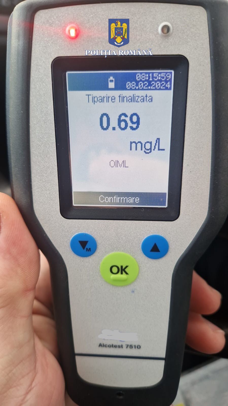 În urma testării cu aparatul etilotest, conducătorul auto a prezentat o alcoolemie cu o valoare de 0,69 mg/l alcool pur în aerul expirat.