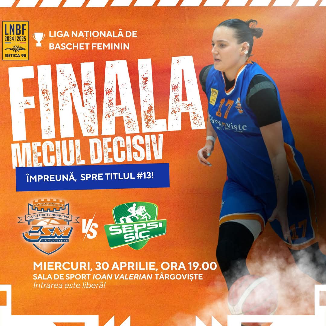 Este seara cea mare pentru Târgoviște! De la ora 19:00, Sala Sporturilor „Ioan Valerian” devine epicentrul pasiunii pentru baschet. CSM Târgoviște înfruntă SEPSI SIC Sfântu Gheorghe în ultimul act al finalei Ligii Naționale. Este meciul decisiv, un duel care poate aduce titlul acasă, după ani de așteptare, luptă și speranță.