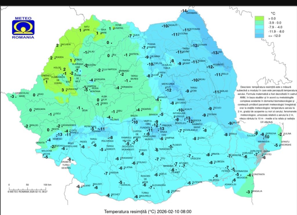 Astăzi, 10 februarie 2026, dimineața la Târgoviște s-au înregistrat temperaturi resimțite de aproximativ -8°C, conform datelor Meteo România.