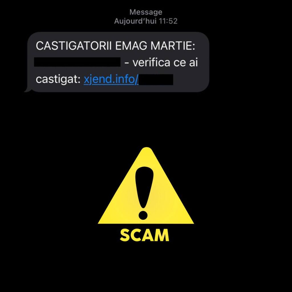 Tentative de fraudă de tip phishing prin folosirea identității vizuale a companiei Emag, în ultimele zile, DNSC a primit informații legate de o tentativă de fraudă propagată prin sms prin transmiterea către utilizatori din România a unor mesaje care conțin link-uri malițioase. Modul în care este formulat mesajul activează emoția (ești fericitul câștigător al unui premiu) și poate determina potențiala victimă să dea click pe link, să ofere date sensibile sau chiar, în anumite instanțe, să instaleze aplicații malițioase.