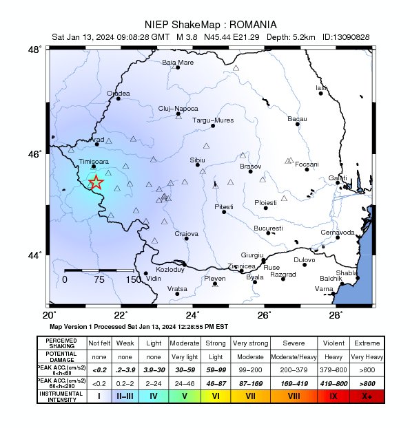 Trei cutremure au avut loc sâmbătă,13 iauarie 2024, în România, primul , în ziua de 13 Ianuarie 2024 la ora 11:08:28 (ora locală a României) s-a produs în BANAT, TIMIS un cutremur slab cu magnitudinea ml 3.8, la adâncimea de 5.2km.
