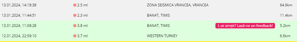 Și cel de-al treilea, în ziua de 13 Ianuarie 2024 la ora 14:18:38 (ora locală a României) s-a produs în ZONA SEISMICA VRANCEA, VRANCEA un cutremur slab cu magnitudinea ml 2.5, la adâncimea de 64.9km.