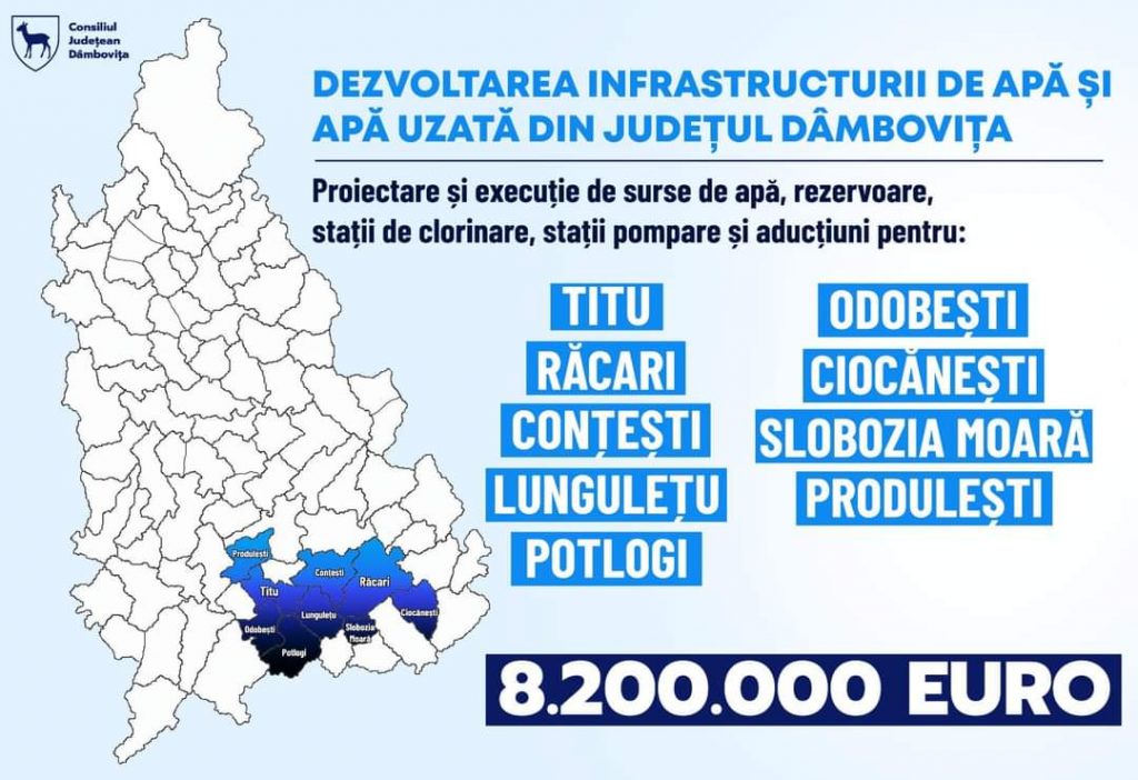 -construcția stației de pompare și a aducțiunilor pentru transmiterea apei din gospodăria de apă Titu în gospodăriile de apă Conțești, Colacu, Răcari, Ciocănești, SloboziaMoară, Pitaru și Lungulețu;
