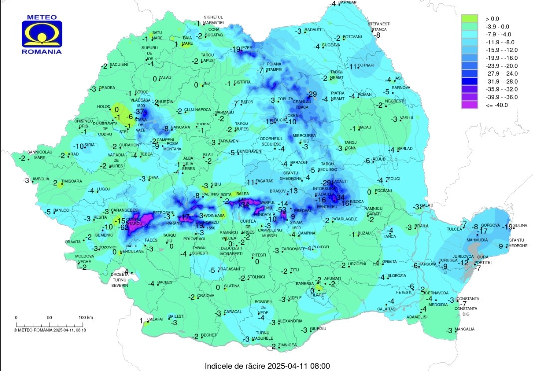 Minimele nocturne vor coborî până la -8 grade Celsius, favorizând formarea de brumă și îngheț la sol, cu potențial impact asupra agriculturii și traficului rutier.